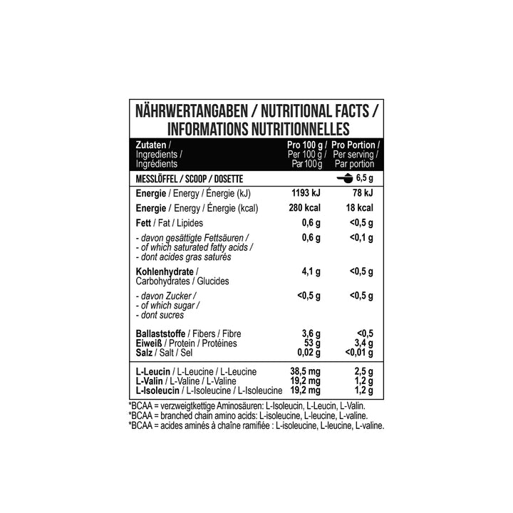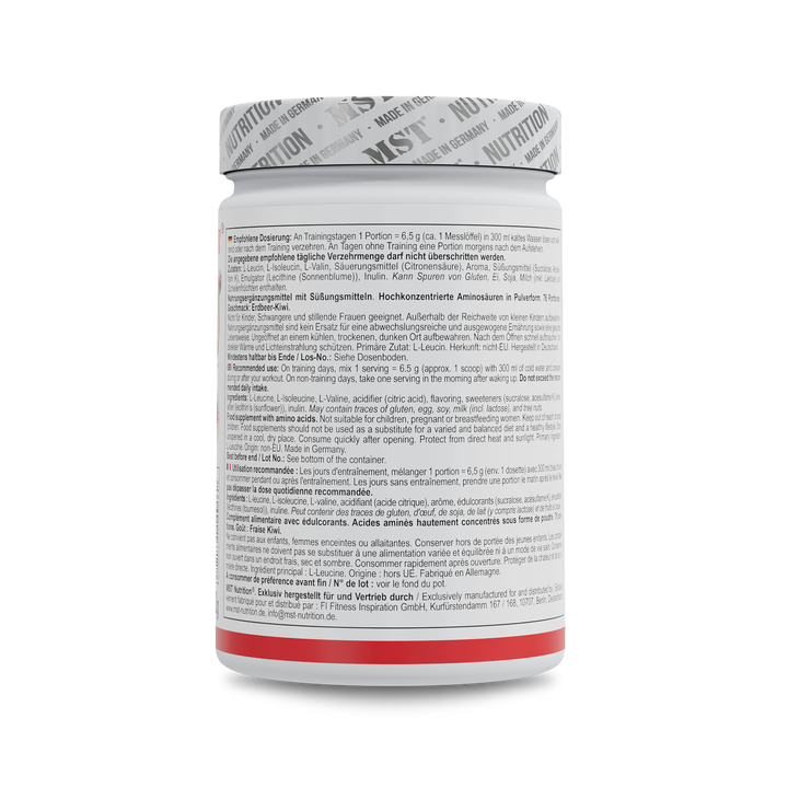 L-Leucin 38,5 %, L-Isoleucin 19,2 %, L-Valin 19,2 %, Säuerungsmittel (Zitronensäure), Inulin, Aroma, Süßungsmittel (Sucralose), Emulgator (Lecithine [Sonnenblume]).